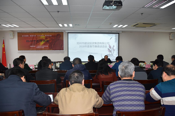 为贯彻落实习近平总书记在十九届中央纪委二次全会上的重要讲话精神和市委书记马懿同志1月18日上午在全市领导干部春节廉洁谈话会上的讲话精神,提醒大家春节期间严格遵守廉洁自律规定,着力营造风清气正、文明祥和的节日环境,1月22日上午,集团公司召开了2018年度春节廉政谈话会。集团公司全体班子成员以及各部门、各项目部、各控股公司负责人、中层副职以上干部共40余人参加了本次会议。